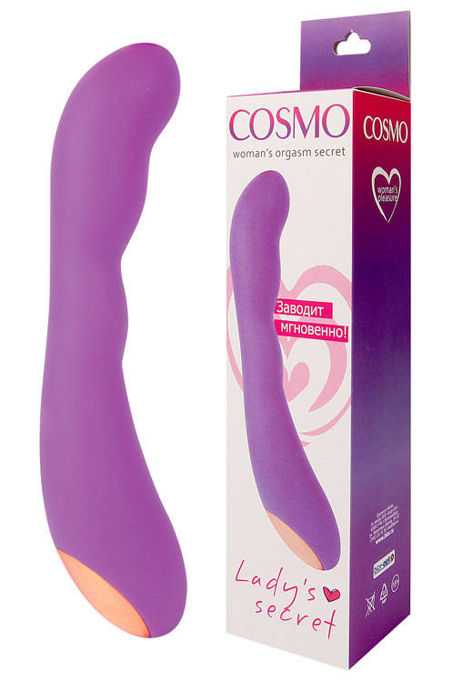 Потрясающий вибромассажер из линейки «COSMO» отлично подойдет для любительниц эротических «приключений». Фантазийная форма интимного аксессуара доставит настоящее удовольствие. Несколько режимов вибрации, воздействие на точку G многократно усилят возбуждающий эффект и доведут женщину до высшей степени наслаждения. Элегантный, приятный на ощупь вагинальный стимулятор длиной 222 мм и диаметром 35 мм выполнен в красивом фиолетовом цвете и украшен золотистой накладкой. Кроме того, в комплекте с секс-игрушкой идет USB-кабель, с помощью которого вибромассажер можно заряжать в автомобиле, а также от компьютера или ноутбука. Это дает возможность всегда держать эротический аксессуар в рабочем состоянии и наслаждаться им в любое удобное время. Вибромассажер изготовлен из безопасного для организма человека материала – гипоаллергенного силикона, имеющего бархатистую текстуру. Изделие очень удобно и комфортно в использовании.